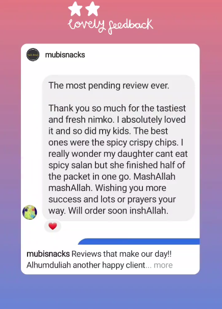 Each snack is carefully and lovingly packed fresh for every order. Initially, we started by delivering to friends, family, and even some corporate clients in Karachi only. Now, we have expanded our delivery services to cover all of Pakistan. It took time and patience to achieve this milestone, and we are grateful for our valued customers’ continued support and loyalty.